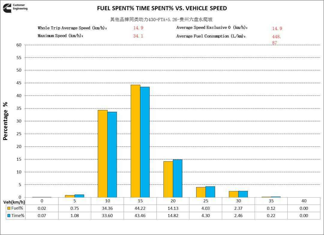 从爬坡工况转速分布看,福康X12动力转速重心在1500rpm,其他品牌动力转速重心在1600~1700rpm,福康X12动力使用转速更低。这就是福康低转速大扭矩的特性,可以让司机选择高一个挡位运行,降低了发动机转速,当然好处就是不仅满足动力性需求,还节油。